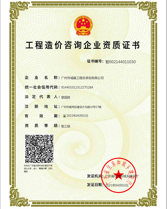 經(jīng)過(guò)公司積極籌備,不斷完善材料,公司工程造價(jià)咨詢暫乙級(jí)資質(zhì)申請(qǐng)順利通過(guò)廣州市住房和城鄉(xiāng)建設(shè)局審批,并于2021年4月2日取得資質(zhì)證書。此次暫乙級(jí)資質(zhì)的獲得,為公司進(jìn)一步開拓工程造價(jià)咨詢市場(chǎng)奠定了基礎(chǔ),使公司的業(yè)務(wù)范圍得到延伸。公司將更加努力拓寬業(yè)務(wù)渠道,不斷提高工程管理服務(wù)水平,同時(shí)為局和院的概預(yù)算工作提供更全面、更專業(yè)的服務(wù)和保障。