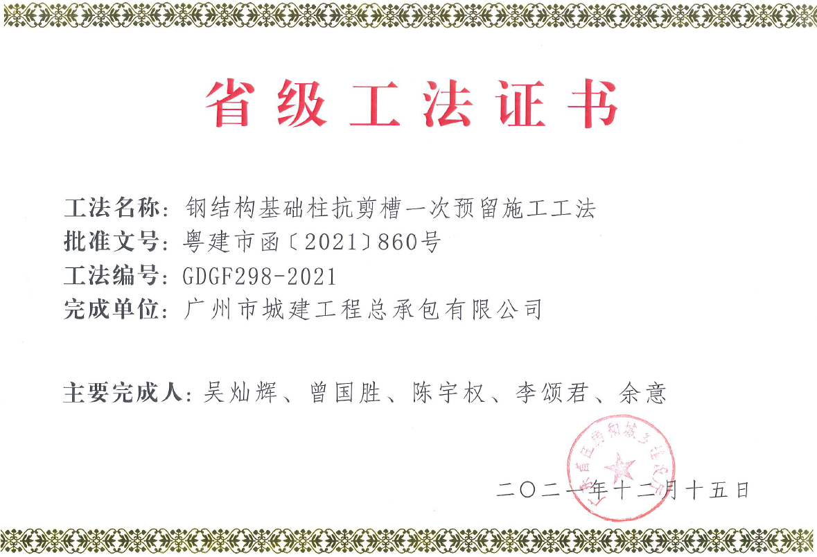 我公司的鋼結(jié)構(gòu)基礎(chǔ)柱抗剪槽一次預(yù)留施工工藝榮獲廣東省省級(jí)工法,并且授予實(shí)用新型專利。
