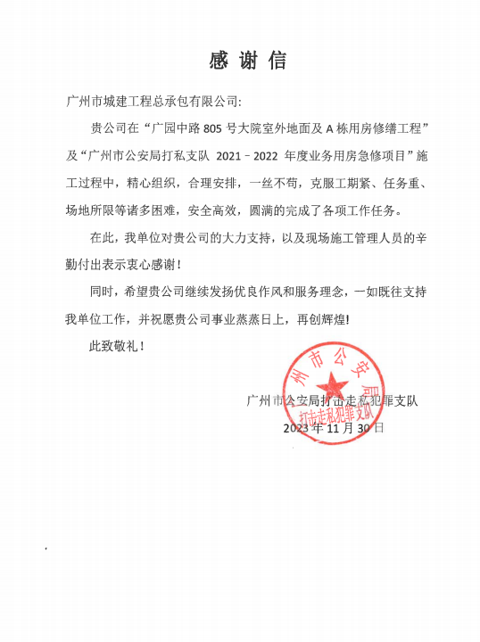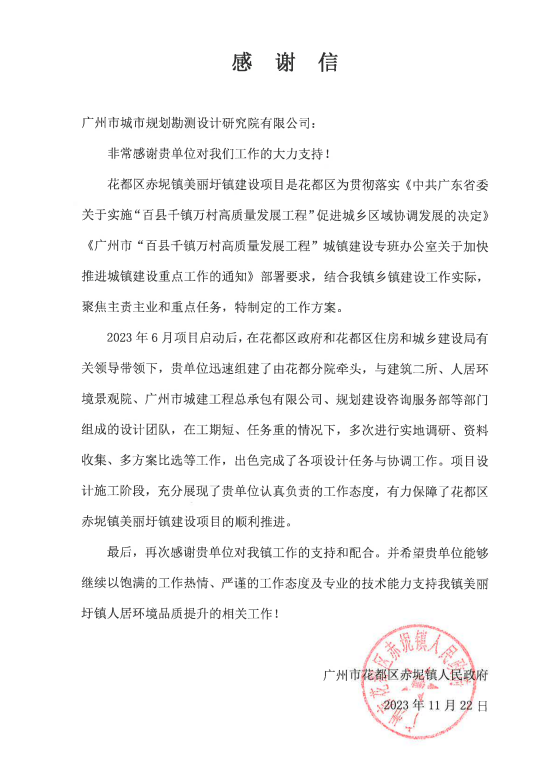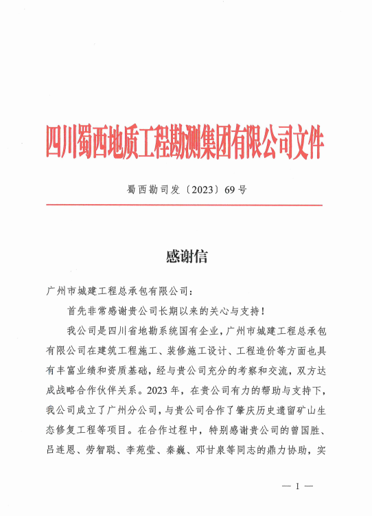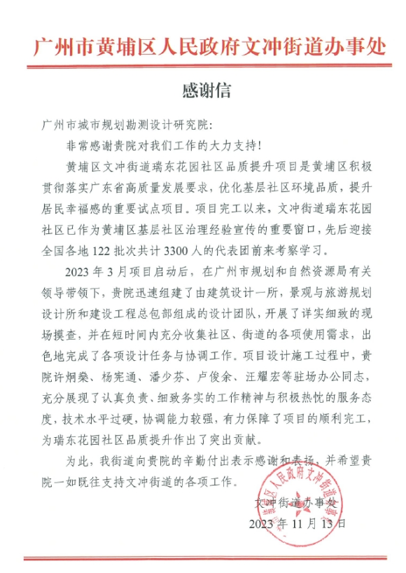 近期,公司陸續(xù)收到多個項目業(yè)主和配合單位發(fā)來的感謝信,黃埔區(qū)文沖街道辦-瑞東花園社區(qū)品質(zhì)提升項目、十六中學(xué)-校本部飯?zhí)酶脑祉椖俊⒒ǘ汲噗桄?zhèn)政府-美麗圩鎮(zhèn)全過程咨詢項目、廣州市公安局打私隊-廣園中路805號大院室外地面及A棟用房修繕工程、廣州市公安局打私支隊2021-2022年度業(yè)務(wù)用房急修項目、四川蜀西地勘集團-肇慶歷史遺留礦山生態(tài)修復(fù)工程等參建單位對公司和項目參與成員所付出的工作表示肯定和感謝。對公司的項目團隊發(fā)揮不怕疲勞、持續(xù)作戰(zhàn)的職業(yè)精神,在高強度駐場工作中表現(xiàn)出的高度工作熱情、強烈工作責(zé)任心、扎實專業(yè)素養(yǎng)和嚴謹細致的工作態(tài)度給予贊揚。