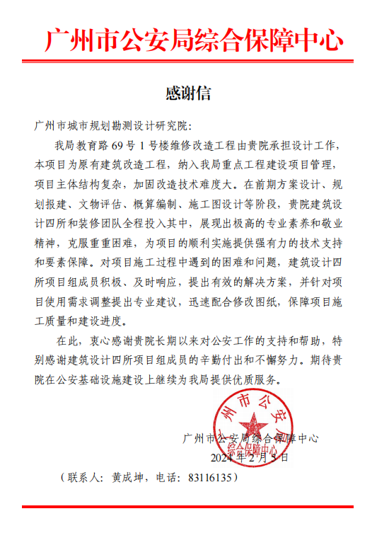 近日,廣州市公安局綜合保障中心發(fā)來感謝信,衷心感謝規(guī)劃院和我公司對教育路 69 號(hào) 1 號(hào)樓維修改造工程設(shè)計(jì)工作的支持,對我公司裝修設(shè)計(jì)團(tuán)隊(duì)在室內(nèi)方案設(shè)計(jì)及施工圖設(shè)計(jì)階段展現(xiàn)出的專業(yè)能力和敬業(yè)精神,保障了項(xiàng)目的順利實(shí)施給予了高度評(píng)價(jià)。為項(xiàng)目的順利實(shí)施提供強(qiáng)有力的技術(shù)支持和要素保障。