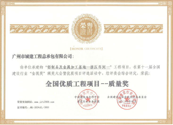 4月,公司積極參加全國建設(shè)行業(yè)“金筑獎(jiǎng)”評(píng)選活動(dòng),經(jīng)綜合評(píng)定,由公司承建的新興鳳鋁公司鋁制品及金屬加工基地--擠壓車間一工程項(xiàng)目榮獲第十一屆“金筑獎(jiǎng)”全國優(yōu)質(zhì)工程項(xiàng)目——質(zhì)量獎(jiǎng)。