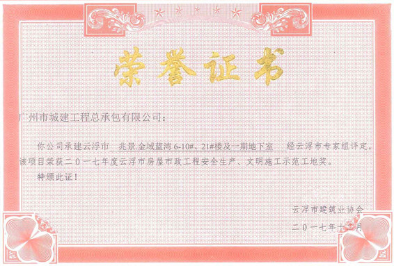 2018年1月,公司金域藍(lán)灣項(xiàng)目喜獲2017年度云浮市房屋市政工程安全生產(chǎn)、文明施工示范工地獎(jiǎng)。自金域藍(lán)灣項(xiàng)目開工以來,公司一直不斷加強(qiáng)安全文明管理力度,并成立了專門的督導(dǎo)組,從技術(shù)、現(xiàn)場(chǎng)、協(xié)調(diào)、...